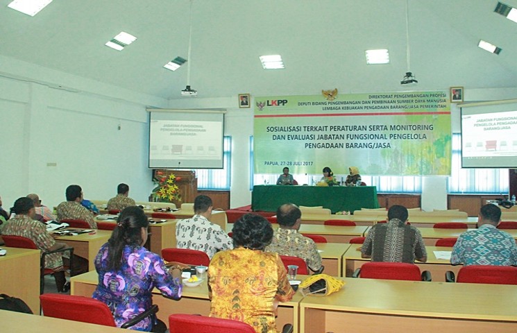 Sosialisasi Terkait Peraturan serta Monitoring dan Evaluasi Jabatan Fungsional Pengelola Pengadaan Barang jasa yang di laksanakan Oleh LKPP, dilaksanakan selama dua hari bertempat di aula Dinas Komunikasi dan Informasi Pemerintah Provinsi Papua dari tanggal dari tanggal 27-28 juli 2017 guna memberikan informasi dan prosedur serta aturan bagi para pejabat fungsional pengadaan barang jasa untuk lebih memahami hak dan kewajibanya sebagai Jafung PPBJ